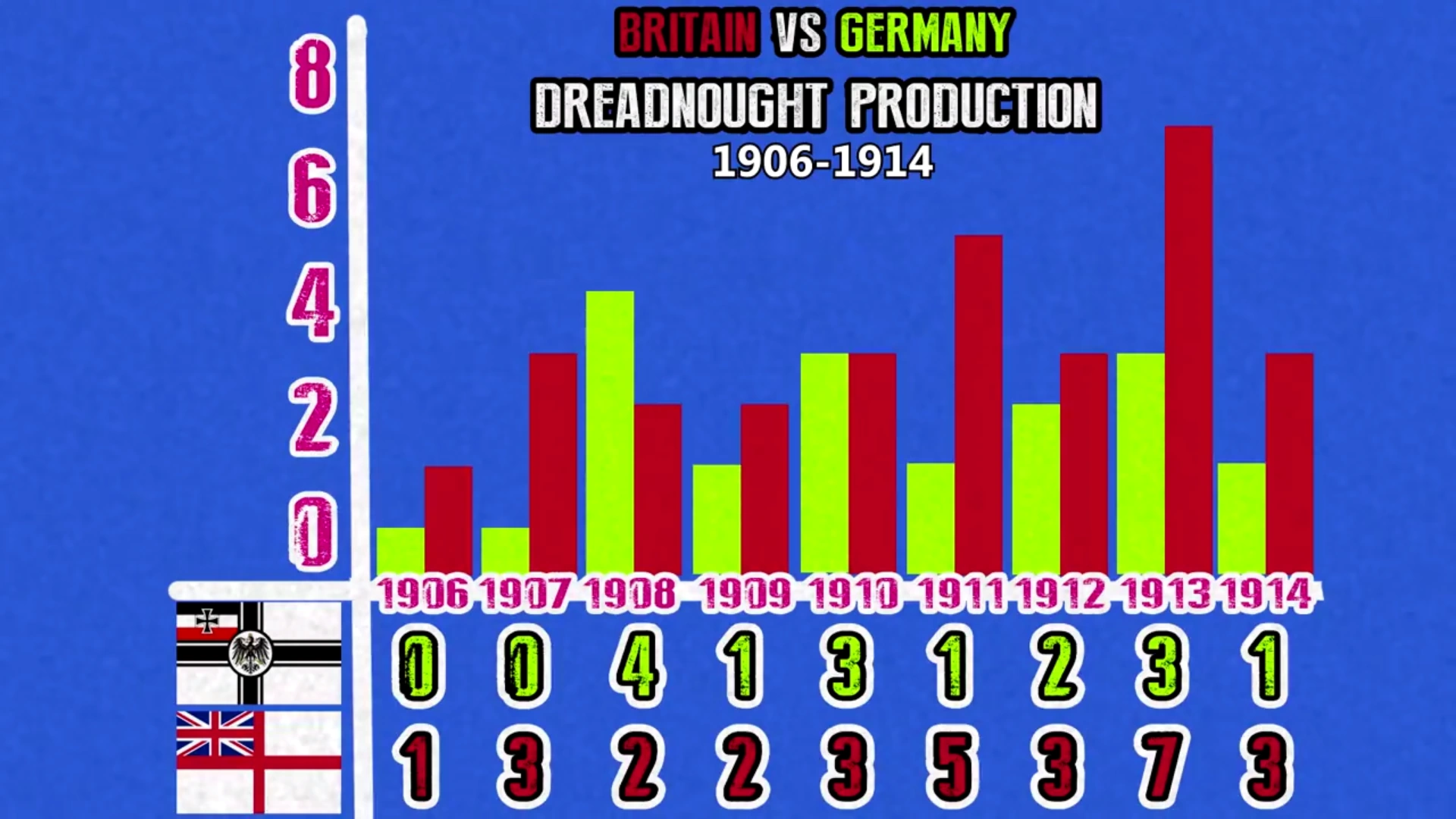 Dreadnought production of Britain vs dreadnought production of Germany in early 1900's.